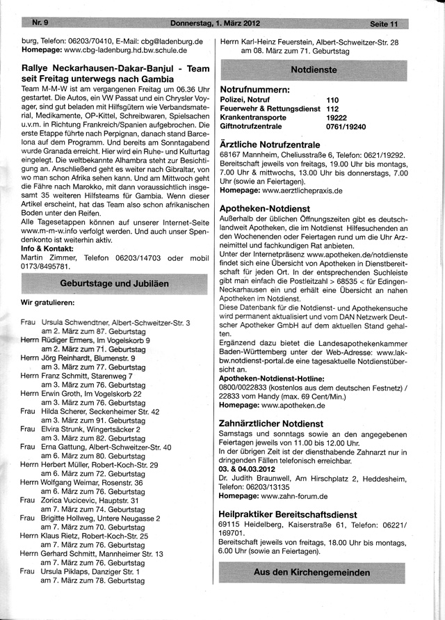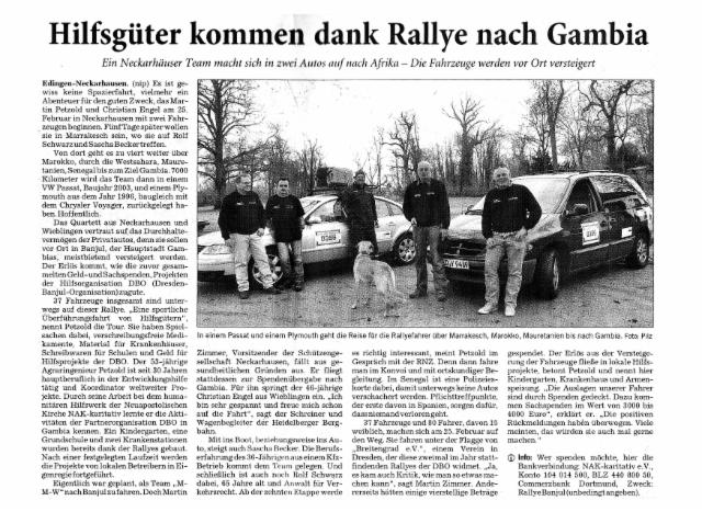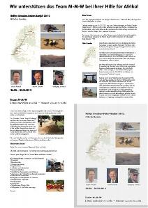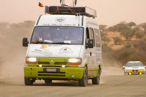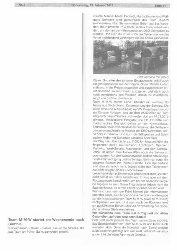 Das Team „M-M-W Neckarhausen“ startet mit zwei Tourenfahrzeuge, ein etwas in die Jahre gekommener aber technisch einwandfreier VW-Passat und ein Chrysler Voyager, die nach dem Zieleinlauf unter Aufsicht der gambischen Regierung meistbietend versteigert werden.