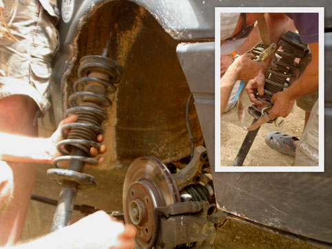 Plötzlich steckte das Heck von Team "Frankenschleicher" im Dreck. Diagnose: Niveauregulierung. Flugs wurde statt der hydraulischen eine Luft-Niveauregulierung installiert. Zwei Fußbälle erledigen das ab sofort.