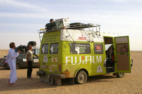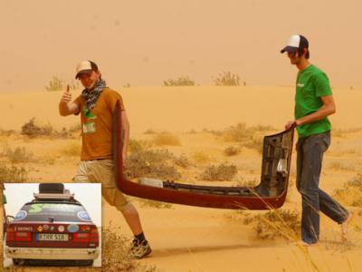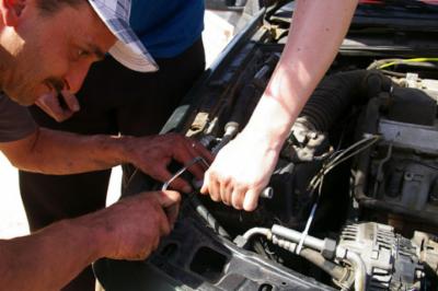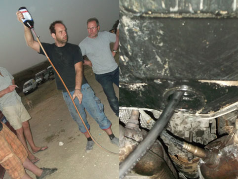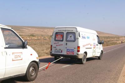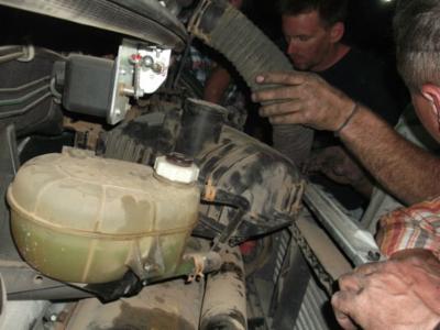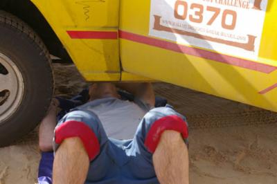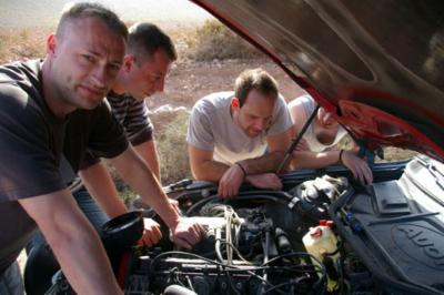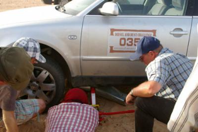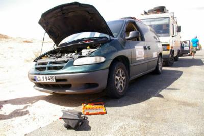 Die Reparatur weiterer Boliden erregte weniger Aufsehen. Bei "Wüstenschulschiff LT31" wurde die Lichtmaschine instand gesetzt und der "Werk Zwei"-Nissan, dessen Kardanwelle sich schon vor der Wüste verabschiedet hatte, rollt auch wieder. Zum guten Schluss wurde auch die Ursachen beim Mitsubishi von "Wild Hare" gefunden: ein lockerer Zahnriemen. Das hätte auch zu einem Motorschaden führen können!