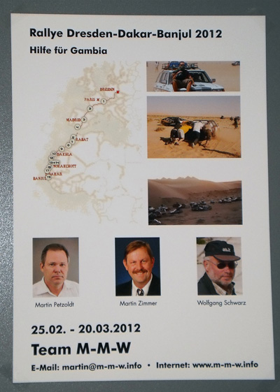 Die beiden Martins tauschen sich wieder einmal aus und fassen eine Teilnahme an der Rallye Dresden-Dakar-Banjul mit eigenen Fahrzeugen in´s Auge. Einige Nachbarn und Freunde zeigen sich zunächst auch interessiert, nehmen aber leider aus den unterschiedlichsten Gründen wieder Abstand von unserem Projekt.