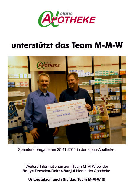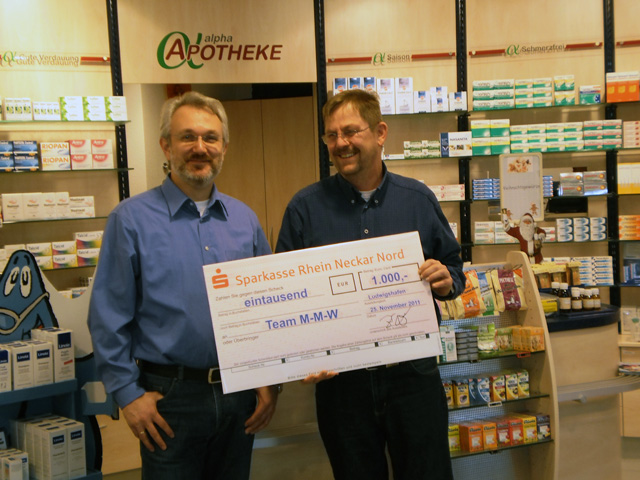 Kein Grund, nicht aktiv zu werden. Und zwar mit Erfolg. Die alpha-Apotheke in Ludwigshafen hat uns heute eine Spende über 1.000 Euro zugesagt !!! Darüber hinaus wird uns Herr Dürrwang Pflaster, Verbandsmaterial und Medikamente zur Verfügung stellen.