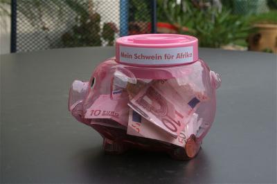 Übrigens habe ich heute ein Schwein organisiert. Es ist transparent-rosa und trägt einen Aufkleber "Mein Schwein für Afrika". Da Frechheit siegt, spreche ich Bekannte direkt an, etwas hinein zu werfen. Münzen zählt das Schwein freundlicherweise selbst und Scheine kann ich manuell eingeben.