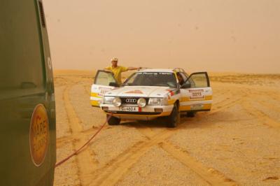 Das nächste Problem ließ nicht lange auf sich warten. Die Jungs von Team “Desert Syncro” hatten heute wirklich Pech. Sie verloren rapide Wasser - Diagnose Kühler defekt. Am Ende ihres Pechtages landeten sie noch am Haken und wieder mal in der langen Rallyegeschichte wurde ein Bolide über den Damm geschleppt.