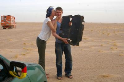 Auch der “Wüstenfuxx” hatte auf dem Damm einen vergleichsweise eher kleinen Schaden. Der Golf verlor fast seinen Auspuff. Jetzt ist er erst mal nicht zu überhören. Das hat ja auch Vorteile im afrikanischen Verkehr!