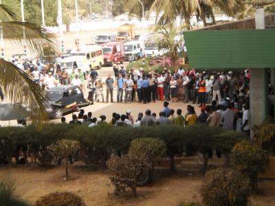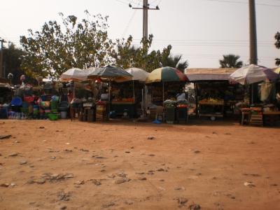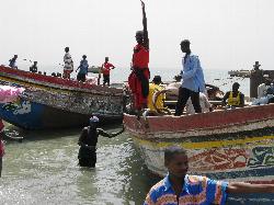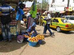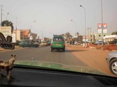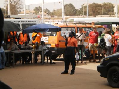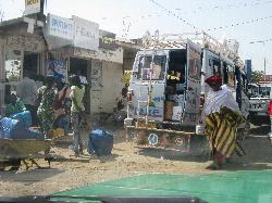 Am Nachmittag machten wir uns auf den Weg zum Hafen, wodie Fähre über den Gambia-River anlegt. Eigentlich keine schlechte Straße, hätte nicht der Präsident des Landes einen Ausflug beschlossen. So waren die Hauptverkehrsstraßen gesperrt und wir mussten uns auf Nebenstraßen zum Hafen "durchschlagen". Da diese ausschließlich von LKW benutzt werden, bestehen sie nur aus Schlaglöchern mit etwas Piste drumrum.