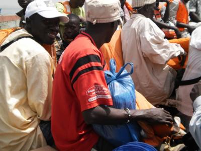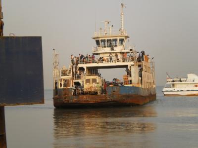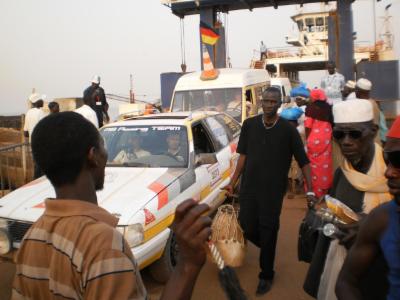 Wie sich herausstellte, waren die Autos auf drei Fähren verteilt. Das wäre weiter nicht schlimm gewesen, hätte nicht die zweite Fähre mitten auf dem Gambia-River einen Motorschaden erlitten. So musste die dritte Fähre im Schiebebetrieb aushelfen.