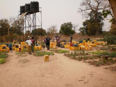 Schließlich erreichten wir auch unser potentielles Projekt. Was als erstes auffiel, waren die vielen Wasserkanister. Außerdem zum Teil winzige Felder in sehr unterschiedlichem Pflegezustand. Es existiert zwar ein Brunnen, der aber nicht sehr ergiebig ist. Und die Wasserverteilung funktioniert auch nicht.
