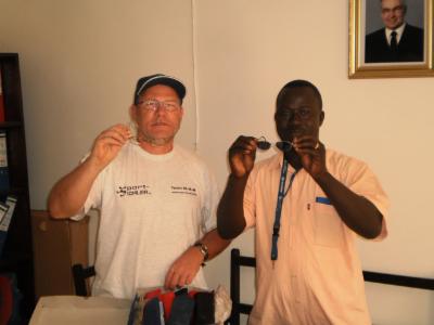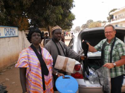 Morgens ging es zunächst wieder Richtung Banjul. Im städtischen Krankenhaus wollten wir die Ersatzteile für ein Beatmungsgerät übergeben. Doch zuvor überreichten wir noch schnell einen Karton mit Brillen an einen örtlichen Optiker.