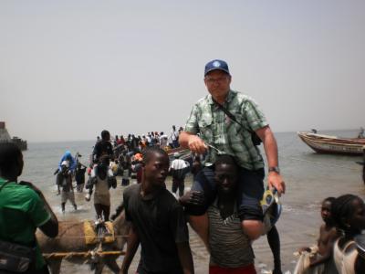 Wie alle Passagiere am Bord ließen wir uns nach einer "rasanten" Überfahrt auf den Schultern einheimischer Träger an Land bringen. Das hat aber nichts mit Überheblichkeit zu tun, sondern es stellt die einzige Möglichkeit das, halbwegs trocken das Ufer zu erreichen.