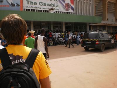 An Bord dann die erste Überraschung: wir hatten wirklich geglaubt, wir seien das erste von unseren Sponsor "Sport-Sichler" unterstütze Team in Westafrika. Aber vor uns saß eindeutig ein Mensch in einem Fußballtrikot eben dieses Sponsors. Wir wissen zwar, dass diese Firma immer sehr umtriebig ist, aber dass sogar Beziehungen zum Fussballverband von Gambia gepflegt werden: Alle Achtung!